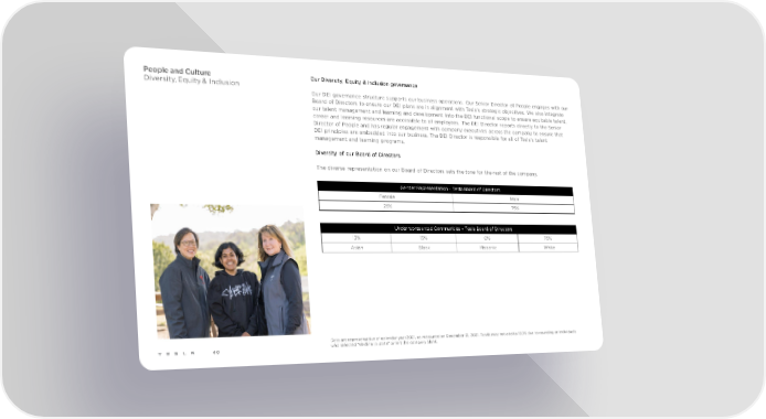 People and Culture Our Diversity, Equity & Inclusion governance Diversity, Equity & Inclusion Our DEI governance structure supports our business operations. Our Senior Director of People engages with our Board of Directors to ensure our DEI plans are in alignment with Tesla’s strategic objectives. We also integrate our talent management and learning and development into the DEI functional scope to ensure equitable talent, career and learning resources are accessible to all employees. The DEI Director reports directly to the Senior Director of People and has regular engagement with company executives across the company to ensure that DEI principles are embedded into our business. The DEI Director is responsible for all of Tesla’s talent management and learning programs. Diversity of our Board of Directors The diverse representation on our Board of Directors sets the tone for the rest of the company. Gender Representation – Tesla Board of Directors Female Male 25% 75% Underrepresented Communities –Tesla Board of Directors 13% 13% 0% 75% Asian Black Hispanic White Data are representative of calendar year 2021, as measured on December 31, 2021. Totals may not add to 100% due to rounding or individuals who selected “decline to state” or left the category blank. 40