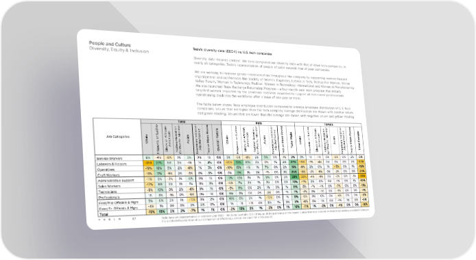 People and Culture Tesla’s diversity data (EEO-1) vs. U.S. tech companies Diversity, Equity & Inclusion Diversity data requires context. We have compared our diversity data with that of other tech companies. In nearly all categories, Tesla’s representation of people of color exceeds that of peer companies. We are working to increase gender representation throughout the company by supporting women-focused organizations and conferences like Society of Women Engineers, Latinas In Tech, TechUp For Women, Silicon Valley Forum, Women in Technology Festival, Women in Technology International and Women in Manufacturing. We also launched Tesla Recharge Returnship Program – a four-month paid work program that initially targeted women impacted by the pandemic and later expanded to support all mid-career professionals transitioning back into the workforce after a leave of one year or more. The table below shows Tesla employee distribution compared to average employee distribution of U.S. tech companies. Values that are higher than the tech company average distribution are shown with positive values and green shading. Values that are lower than the average are shown with negative values and yellow shading. Total r s Male r s Female r s o r o e o r o e a r o e in n e c in n e c in n e c a an d n e ls a an d n e t a and n e e t i a t i a i a ic i n a v a ic i n a v e a ic i n a v a r n a la i i R t a r n a la i i R r n a la i i R al e L f a s n at e o e L f a s n at e al e L f a s n at e m Job Categories r ic aw I nd r ic aw I nd r ic awI nd e it Ar ia I N or it Ar ia I N or M it o Ar ia I N or h o r e H ic s n a ll T h o r e H ic s n a al h ic r e Hic s n a F W ic om e if A a k M a W ic om e if A a k M t W om e if A a k M n k c c r n k c c n k c c al v i e v i o v i t a c A i a r as or a c A i a r as or a c A i a r as or p la at P e l o v p la at P e l o T p la at P e l o o is B N r m A w O is B N r m A w is B N r m A w T H O A T H O A T H O A T Service Workers 6% -4% -9% 1% 5% 0% 1% 0% 3% -5% -8% 2% 11% 0% -1% 2% 3% 1% -1% 0% -6% 0% 2% -2% Laborers & Helpers -39% 27% 6% 2% -1% 1% 4% 0% -20% 30% 10% 2% 0% 1% 4% 27% -19% -3% -4% 0% 0% 0% 0% -27% Operatives -19% 16% 5% 2% -8% 1% 3% 0% -10% 13% 4% 1% 7% 0% 2% 19% -9% 2% 0% 1% -15% 0% 1% -19% Craft Workers -13% 17% -5% 2% -3% 0% 3% 0% 0% 19% 1% 2% -1% 0% 3% 24% -13% -2% -6% 0% -2% 0% 0% -24% Administrative Support -11% 5% -3% 1% 6% 0% 1% 0% 15% 10% 1% 1% 9% 0% 2% 38% -26% -4% -4% 0% -2% 0% -1% -38% Sales Workers -17% 9% 3% 1% 1% 0% 3% 0% -6% 7% 3% 1% 3% 0% 2% 10% -11% 2% 0% 0% -1% 0% 1% -10% Technicians -8% 10% 0% 2% -6% 0% 1% 0% -5% 11% 0% 2% 1% 0% 1% 11% -3% -1% -1% 0% -7% 0% 0% -11% Professionals 1% 3% -1% 0% -5% 0% 1% 0% 6% 3% 0% 0% -2% 0% 1% 7% -4% 0% -1% 0% -3% 0% 0% -7% First/Mid Officials & Mgrs 5% 6% 2% 1% -15% 0% 2% 0% 10% 6% 2% 1% -10% 0% 1% 9% -5% 0% 0% 0% -4% 0% 0% -9% Exec/Sr. Officials & Mgrs -4% 1% 0% 0% 2% 2% 0% 0% 1% 1% -1% 0% 2% 1% 0% 5% -6% 0% 1% 0% -1% 1% 0% -5% Total -13% 15% 2% 2% -7% 1% 1% 0% -2% 13% 3% 1% -2% 0% 1% 16% -11% 1% -2% 0% -4% 0% 0% -16% 37 Tesla data are representative of calendar year 2020 – the latest available EEO-1 filing as of the publishing of this report. Competitor data is based on their latest publicly available disclosure. For a detailed explanation of our comparison methodology, please see page 134 of this report.