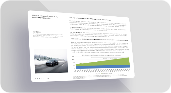 1 Lifecycle Analysis of Tesla EVs vs. Using only real-world data, not official NEDC, WLPT or EPA consumption data Equivalent ICE Vehicles The most important variable in a lifecycle analysis of an automobile is real-world fuel consumption or electricity consumption, as applicable, which impacts the use-phase of the lifecycle. Various efficiency testing cycles such as NEDC, WLTP or EPA do not truly represent real-world fuel or energy consumption. Therefore, we used: EV energy consumption: Real world energy consumption based on 25 billion miles traveled Tesla Model 3 and Model Y vehicles, including energy losses during the charging process. 70 tons ICE fuel consumption: Data provided by Consumer Reports, which reports model year 2020 mid-size premium sedans achieve 24.3 MPG on average. This translates to over 400 grams of CO2e per mile once we account for Lifetime CO e emitted by an average internal combustion engine 2 emissions generated through the extraction, refining and shipment of oil. vehicle (model year 2021) sold in the U.S. through its use-phase, excluding CO2e emitted during the oil refining phase. The carbon impact of ICE vehicles remains the same every year of use, but for EVs, it should improve every year Based on publicly available sales and fleet data, we estimate that an average vehicle in the U.S. is driven slightly less than 12,000 miles per year for about 17 years before it is scrapped. Furthermore, as an ICE vehicle ages, its fuel efficiency only remains stable if serviced properly. On the other hand, electricity generation to charge EVs has become “greener” over time with the addition of cleaner energy sources to the grid. Below, we show zero- emission electricity generation capacity (including nuclear) in the U.S. since 2015. Even without factoring in any changes to federal policy or an acceleration of the adoption of renewables in the U.S. (which is likely), if current trends remain stable, emissions generated through EV charging should continue to decline over time. U.S. Electricity Grid Generation Mix (assuming continuation of recent tends) 80% Average U.S. vehicle lifetime 60% 40% 20% 0% Nuclear Zero-Emission Sources 58 1NEDC = New European Driving Cycle; WLPT = Worldwide Harmonized Light Vehicles Test Procedure; EPA = U.S. Environmental Protection Agency 22021-2040 Tesla estimate based on recent grid mix shifts. Conservatively assumes no change in federal policy or acceleration of move to renewables in the U.S. for electricity generation.