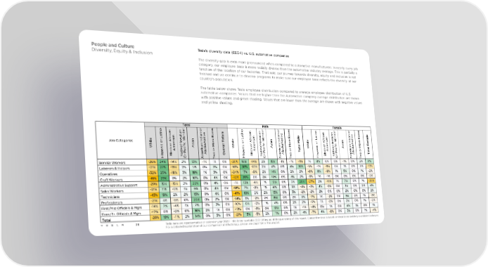 People and Culture Tesla’s diversity data (EEO-1) vs. U.S. automotive companies Diversity, Equity & Inclusion The diversity gap is even more pronounced when compared to automotive manufacturers. In nearly every job category, our employee base is more racially diverse than the automotive industry average. This is partially a function of the location of our factories. That said, our journey towards diversity, equity and inclusion is not finished and we continue to develop programs to make sure our employee base reflects the diversity of our country's population. The table below shows Tesla employee distribution compared to average employee distribution of U.S. automotive companies. Values that are higher than the Automotive company average distribution are shown with positive values and green shading. Values that are lower than the average are shown with negative values and yellow shading. Total r s Male r s Female r s o r o e o r o e a r o e in n e c in n e c in n e c a an d n e ls a an d n e t a and n e e t i a t i a i a ic i n a v a ic i n a v e a ic i n a v a r n a la i i R t a r n a la i i R r n a la i i R al e L f a s n at e o e L f a s n at e al e L f a s n at e m Job Categories r ic aw I nd r ic aw I nd r ic awI nd e it A r ia I N or it Ar ia I N or M it o Ar ia I N or h o r e H ic s n a ll T h o r e H ic s n a al h ic r e Hic s n a F W ic o m e if A a k M a W ic om e if A a k M t W om e if A a k M n k c c r n k c c n k c c al v i e v i o v i t a c A i a r as or a c A i a r as or a c A i a r as or p la at P e l o v p la at P e l o T p la at P e l o o is B N r m A w O is B N r m A w is B N r m A w T H O A T H O A T H O A T Service Workers -26% 24% -14% 2% 13% -1% 1% 0% -28% 16% -14% 2% 15% -1% -1% -11% 1% 8% 0% 0% -1% 0% 2% 11% Laborers & Helpers -21% 27% -19% 2% 5% 0% 5% 0% -16% 28% -10% 2% 4% 0% 4% 13% -5% -1% -9% 0% 1% 0% 0% -13% Operatives -32% 25% -18% 3% 19% 1% 3% 0% -24% 17% -9% 2% 14% 0% 2% 2% -8% 8% -9% 1% 5% 0% 1% -2% Craft Workers -45% 29% 0% 2% 10% 0% 4% 0% -42% 29% 0% 2% 10% 0% 4% 2% -3% 1% -1% 0% 0% 0% 0% -2% Administrative Support -29% 15% -15% 2% 22% 0% 4% 0% -1% 13% -4% 1% 15% 0% 3% 26% -27% 2% -10% 1% 7% 0% 1% -26% Sales Workers -21% 11% -5% 1% 9% 0% 4% 0% -18% 7% -2% 1% 6% 0% 3% -4% -3% 4% -2% 0% 3% 0% 2% 4% Technicians -43% 19% 2% 2% 15% 0% 4% 0% -41% 18% 2% 2% 13% 0% 3% -2% -2% 2% 0% 0% 2% 0% 0% 2% Professionals -21% 4% -5% 0% 20% 0% 2% 0% -14% 3% -2% 0% 15% 0% 2% 3% -7% 1% -2% 0% 5% 0% 1% -3% First/Mid Officials & Mgrs -14% 7% -4% 1% 7% 0% 3% 0% -10% 6% -2% 1% 4% 0% 2% 2% -5% 1% -2% 0% 2% 0% 1% -2% Exec/Sr. Officials & Mgrs -17% 0% -2% 0% 16% 2% 1% 0% -13% 0% -3% 0% 13% 0% 1% -1% -4% 0% 1% 0% 4% 1% 0% 1% Total -28% 19% -11% 2% 14% 0% 3% 0% -21% 15% -5% 2% 11% 0% 2% 4% -7% 4% -6% 0% 3% 0% 1% -4% 38 Tesla data are representative of calendar year 2020 – the latest available EEO-1 filing as of the publishing of this report. Competitor data is based on their latest publicly available disclosure. For a detailed explanation of our comparison methodology, please see page 134 of this report.