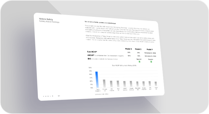 Vehicle Safety Not all Active Safety systems are created equal Safety Assist Ratings Many people assume that AEB (Automatic Emergency Breaking) –a system that most new vehicles are equipped with – works equally well with all vehicles. That’s not the case. The range of sensors, compute power and quality of software in the system can vary dramatically. Our active safety features are powered by eight cameras, a neural-net computer and learnings from our fleet of over two million cars. After the introduction of Tesla Vision (a vision-only system that excludes radar), our active safety ratings with IIHS improved. Pedestrian AEB performance of our Tesla Vision was over 45% better than performance of vision + radar. It is no surprise that the active safety score achieved by Tesla Model 3 Euro NCAP remains an outlier. Model X Model 3 Model Y Euro NCAP* 94% 94% Scheduled for 2022 ANCAP* (Australasian New Car Assessment Program) 94% 94% Scheduled for 2022 IIHS (Insurance Institute for Highway Safety) Superior Superior Euro NCAP Safety Assist Rating (2019) 100% 95% 90% 85% 80% 75% 70% Tesla Citroen VW Audi SEAT Skoda Mercedes Subaru VW Lexus Model 3 C5 T-Cross A1 Tarraco Octavia GLE Forester Golf UX *2019 Safety Assist ratings 84