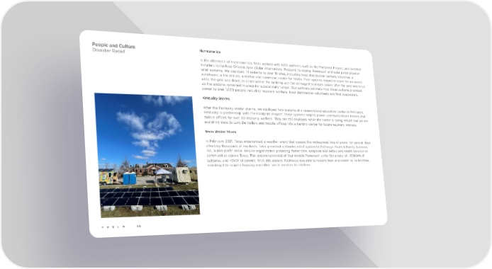 People and Culture Hurricane Ida Disaster Relief In the aftermath of Hurricane Ida, Tesla worked with NGO partners such as the Footprint Project, and certified installers in the New Orleans Area (Solar Alternatives, Posigen) to deploy Powerwall and solar panel disaster relief systems. We deployed 14 systems to over 10 sites, including food distribution centers, churches, a warehouse, a fire station, a shelter and command center for NGOs. Most systems stayed in place for six weeks while the grid was down; in cases where the building was too damaged to return power after the grid was back up the systems remained in place for substantially longer. Our partners estimate that these systems provided power to over 1,000 people including recovery workers, food distribution volunteers and first responders. Kentucky Storms After the Kentucky winter storms, we deployed two systems at a research and education center in Princeton, Kentucky in partnership with the Footprint Project. These systems helped power communications trailers and mobile offices for over 50 recovery workers. They are still deployed while the center is being rebuilt and we are exploring ways to turn the trailers and mobile offices into a training center for future recovery workers. Texas Winter Storm In February 2021, Texas experienced a weather event that caused the widespread loss of power for several days affecting thousands of residents. Tesla provided a disaster relief system to Pathways Youth & Family Services, Inc., a non-profit social service organization providing foster care, adoption and behavioral health services to communities across Texas. The system consisted of four mobile Powerwall units (for a total of ~100kWh of batteries and 40kW of power). With this system, Pathways was able to restore heat and power to its facilities, enabling it to resume housing and other social services to children. 46