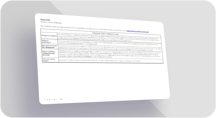 Appendix Supply Chain Policies The following tables provide summaries of our responsible sourcing policies, the full text of which can be found on our Responsible Sourcing Policies page: Tesla Supplier Code of Conduct (continued) Suppliers shall adopt or establish a management system with a scope that is related to the content of the Code of Conduct. The management system shall be designed to Management Systems ensure: (a) compliance with applicable laws, regulations and customer requirements related to the Supplier’s operations and products; (b) conformance with this Code; and (c) identification and mitigation of operational risks related to this Code. It should also facilitate continual improvement. Company Corporate social and environmental responsibility policy statements affirming Supplier’s commitment to compliance and continual improvement, endorsed by executive Commitment management, and posted in the facility in the local language. Risk Assessment and A process to identify the legal compliance, environmental, health and safety labor practice and ethics risks associated with Supplier’s operations. Determination of the relative Risk Management significance for each risk and implementation of appropriate procedural and physical controls to control the identified risks and ensure regulatory compliance. Worker Feedback, Ongoing processes, including an effective grievance mechanism, to assess workers’ understanding of and obtain feedback on or violations against practices and conditions Participation and covered by this Code and to foster continuous improvement. Workers must be given a safe environment to provide grievance and feedback without fear of reprisal or Grievance retaliation. Suppliers must periodically provide workers with information on all grievance procedures. No retaliation against workers for raising workplace concerns may be tolerated, including personal attacks, intimidation, or other threats against workers. Corrective Action A process for timely correction of deficiencies identified by internal or external assessments, inspections, investigations, and reviews. Process 131