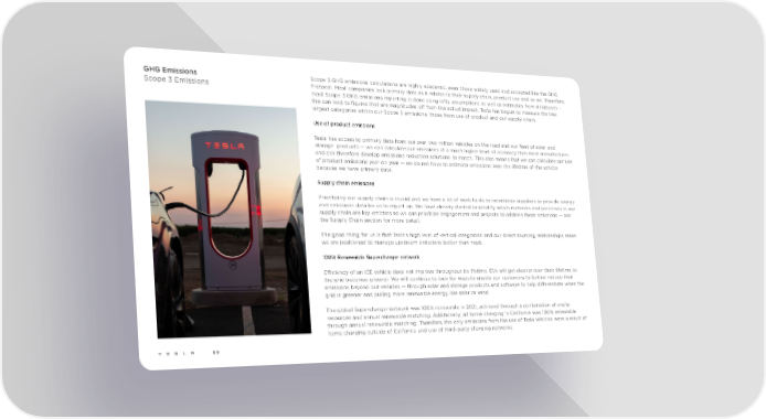 GHG Emissions Scope 3 GHG emissions calculations are highly academic, even those widely used and accepted like the GHG Scope 3 Emissions Protocol. Most companies lack primary data as it relates to their supply chain, product use and so on. Therefore, most Scope 3 GHG emissions reporting is done using lofty assumptions as well as estimates from databases – this can lead to figures that are magnitudes off from the actual impact. Tesla has begun to measure the two largest categories within our Scope 3 emissions: those from use of product and our supply chain. Use of product emissions Tesla has access to primary data from our over two million vehicles on the road and our fleet of solar and storage products — we can calculate our emissions at a much higher level of accuracy than most manufactures and can therefore develop emissions reduction solutions to match. This also means that we can calculate our use of product emissions year on year —we do not have to estimate emissions over the lifetime of the vehicle because we have primary data. Supply chain emissions Prioritizing our supply chain is crucial and we have a lot of work to do to incentivize suppliers to provide energy and emissions data for us to report on. We have already started to identify which materials and processes in our supply chain are key emitters so we can prioritize engagement and projects to address these emissions — see the Supply Chain section for more detail. The good thing for us is that Tesla’s high level of vertical integration and our direct sourcing relationships mean we are positioned to manage upstream emissions better than most. 100% Renewable Supercharger network Efficiency of an ICE vehicle does not improve throughout its lifetime. EVs will get cleaner over their lifetime as the grid becomes greener. We will continue to look for ways to enable our customers to further reduce their emissions beyond our vehicles — through solar and storage products and software to help differentiate when the grid is greener and pulling more renewable energy like solar or wind. The global Supercharger network was 100% renewable in 2021, achieved through a combination of onsite resources and annual renewable matching. Additionally, all home charging in California was 100% renewable through annual renewable matching. Therefore, the only emissions from the use of Tesla vehicles were a result of home charging outside of California and use of third-party charging networks. 69