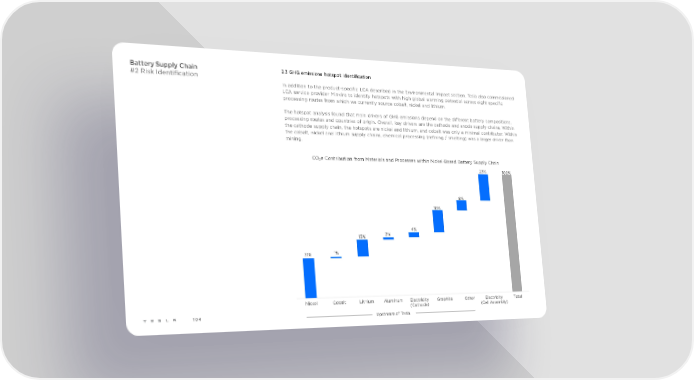 Battery Supply Chain 2.3 GHG emissions hotspot identification #2 Risk Identification In addition to the product-specific LCA described in the Environmental Impact section, Tesla also commissioned LCA service provider Minviro to identify hotspots with high global warming potential across eight specific processing routes from which we currently source cobalt, nickel and lithium. The hotspot analysis found that main drivers of GHG emissions depend on the different battery compositions, processing routes and countries of origin. Overall, key drivers are the cathode and anode supply chains. Within the cathode supply chain, the hotspots are nickel and lithium, and cobalt was only a minimal contributor. Within the cobalt, nickel and lithium supply chains, chemical processing (refining / smelting) was a larger driver than mining. CO2e Contribution from Materials and Processes within Nickel-Based Battery Supply Chain 23% 100% 8% 18% 4% 13% 2% 31% 1% Nickel Cobalt Lithium Aluminum Electricity Graphite Other Electricity Total (Cathode) (Cell Assembly) 104 Upstream of Tesla