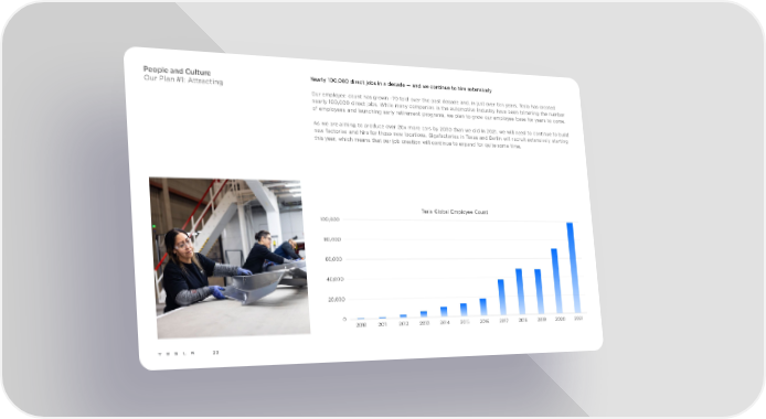 People and Culture Nearly 100,000 direct jobs in a decade — and we continue to hire extensively Our Plan #1: Attracting Our employee count has grown ~70 fold over the past decade and, in just over ten years, Tesla has created nearly 100,000 direct jobs. While many companies in the automotive industry have been trimming the number of employees and launching early retirement programs, we plan to grow our employee base for years to come. As we are aiming to produce over 20x more cars by 2030 than we did in 2021, we will need to continue to build new factories and hire for those new locations. Gigafactories in Texas and Berlin will recruit extensively starting this year, which means that our job creation will continue to expand for quite some time. Tesla Global Employee Count 100,000 80,000 60,000 40,000 20,000 0 2010 2011 2012 2013 2014 2015 2016 2017 2018 2019 2020 2021 23