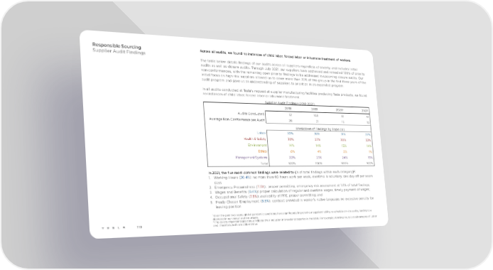 Responsible Sourcing Across all audits, we found no instances of child labor, forced labor or inhumane treatment of workers Supplier Audit Findings The table below details findings of our audits across all suppliers regardless of severity and includes initial audits as well as closure audits. Through July 2021, our suppliers have addressed and remedied 100% of priority non-conformances, with the remaining open priority findings to be addressed in upcoming closure audits. Our initial focus on high-risk suppliers allowed us to cover more than 70% of this group in the first three years of the audit program and gave us an understanding of suppliers to prioritize in an expanded program. In all audits conducted at Tesla's request at supplier manufacturing facilities producing Tesla products, we found no instances of child labor, forced labor or inhumane treatment. Supplier Audit Findings (2018-2021) 1 1 2018 2019 2020 2021 Audits Conducted 12 108 81 41 Average Non-Conformance per Audit 28 21 16 15 Breakdown of Findings by Topic (%) Labor 30% 30% 31% 37% Health & Safety 30% 27% 30% 33% Environment 14% 14% 13% 14% Ethics 6% 4% 2% 1% Management Systems 20% 25% 24% 15% Total 100% 100% 100% 100% In 2021, the five most common findings were related to (% of total findings within each category)2: 1. Working Hours (20.4%): no more than 60 hours work per week, overtime is voluntary, one day off per seven days 2. Emergency Preparedness (11.1%): proper permitting, emergency risk assessment at 11.1% of total findings; 3. Wages and Benefits (9.4%): proper calculation of regular and overtime wages, timely payment of wages; 4. Occupational Safety (7.5%): availability of PPE, proper permitting; and 5. Freely Chosen Employment (5.5%): contract provided in worker’s native language, no excessive penalty for leaving position 1 Over the past two years, global pandemic conditions have significantly impacted our suppliers’ ability to schedule on-site audits, leading to a decrease in our annual audit numbers. 2 The colors of percentages above indicate their inclusion in broader categories in the table. For example, Working Hours is a subcategory of Labor 115 and, therefore, both are colored blue.