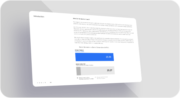 Introduction What Do We See As Impact? The biggest environmental impact is achieved through early displacement of ICE vehicles and replacing them with EVs. Additionally, we want to displace fossil-based energy generation with renewable energy generation. As of the end of 2021, Tesla (including SolarCity prior to its 2016 acquisition by Tesla) has installed almost 4.0 Gigawatts of solar systems and cumulatively generated over 25.0 Terawatt-hours (TWhs) of emissions-free electricity. For reference, that is more energy generated by our installations than the total energy Tesla has used to run all our factories since we began producing Model S in 2012 and electricity used to power all of our vehicles in that same period combined. We are striving to always remain a net contributor to renewable energy generation. It is our goal to eventually have all our manufacturing energy needs satisfied through renewable sources where possible. Additionally, we are hoping to see more Tesla vehicle customers installing solar panels or Solar Roof along with a Powerwall to meet their own energy needs in a sustainable way. Energy Generation vs. Energy Consumption (in TWh) 56