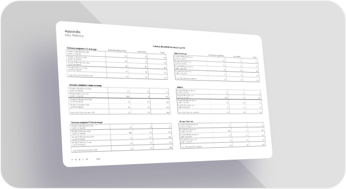 Appendix Key Metrics Average Lifecycle Emissions (gCO2e/mi) Delivery-weighted U.S. Average Manufacturing Phase use-phase Total New York State Manufacturing Phase use-phase Total Model 3 Ridesharing Use Model 3 Ridesharing Use (solar charged) 29 0 29 (solar charged) 29 0 29 Model 3 Personal Use Model 3 Personal Use (solar charged) 70 0 70 (solar charged) 70 0 70 Model 3 Ridesharing Use Model 3 Ridesharing Use (grid charged) 10 111 121 (grid charged) 10 78 88 Model 3 Personal Use Model 3 Personal Use (grid charged) 51 111 162 (grid charged) 51 78 129 Avg. Mid-Size Premium ICE 48 417 465 Avg. Mid-Size Premium ICE 48 417 465 Delivery-weighted Europe Average Austria Model 3 Ridesharing Use Model 3 Ridesharing Use (solar charged) 31 0 31 (solar charged) 31 0 31 Model 3 Personal Use Model 3 Personal Use (solar charged) 100 0 100 (solar charged) 100 0 100 Model 3 Ridesharing Use Model 3 Ridesharing Use (grid charged) 12 48 60 (grid charged) 12 35 47 Model 3 Personal Use Model 3 Personal Use (grid charged) 81 48 130 (grid charged) 81 35 116 Avg. Mid-Size Premium ICE 63 417 480 Avg. Mid-Size Premium ICE 63 417 480 Delivery-weighted China Average Sichuan Province Model 3 Ridesharing Use Model 3 Ridesharing Use (solar charged) 31 0 31 (solar charged) 31 0 31 Model 3 Personal Use Model 3 Personal Use (solar charged) 100 23 123 (solar charged) 100 4 105 Model 3 Ridesharing Use Model 3 Ridesharing Use (grid charged) 12 172 184 (grid charged) 12 33 45 Model 3 Personal Use Model 3 Personal Use (grid charged) 81 172 253 (grid charged) 81 33 114 Avg. Mid-Size Premium ICE 63 417 480 Avg. Mid-Size Premium ICE 63 417 480 122