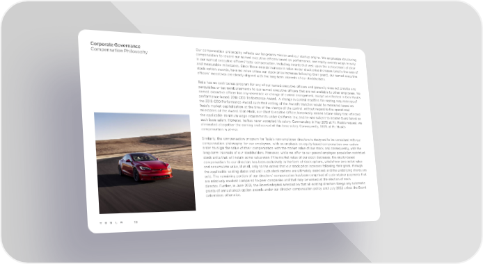 Corporate Governance Our compensation philosophy reflects our long-term mission and our startup origins. We emphasize structuring Compensation Philosophy compensation to reward our named executive officers based on performance, and equity awards weigh heavily in our named executive officers’ total compensation, including awards that vest upon the achievement of clear and measurable milestones. Since these awards increase in value as our stock price increases (and in the case of stock option awards, have no value unless our stock price increases following their grant), our named executive officers’ incentives are closely aligned with the long-term interests of our stockholders. Tesla has no cash bonus program for any of our named executive officers and generally does not provide any perquisites or tax reimbursements to our named executive officers that are not available to other employees. No named executive officer has any severance or change of control arrangement, except as reflected in Elon Musk’s performance-based 2018 CEO Performance Award. A change in control modifies the vesting requirements of the 2018 CEO Performance Award such that vesting of the Award’s tranches would be measured based on Tesla’s market capitalization at the time of the change of the control, without regard to the operational milestones of the Award. Elon Musk, our Chief Executive Officer, historically earned a base salary that reflected the applicable minimum wage requirements under California law, and he was subject to income taxes based on such base salary. However, he has never accepted his salary. Commencing in May 2019 at Mr. Musk’s request, we eliminated altogether the earning and accrual of this base salary. Consequently, 100% of Mr. Musk’s compensation is at-risk. Similarly, the compensation program for Tesla’s non-employee directors is designed to be consistent with our compensation philosophy for our employees, with an emphasis on equity-based compensation over cash in order to align the value of their compensation with the market value of our stock, and consequently, with the long-term interests of our stockholders. Moreover, while we offer to our general employee population restricted stock units that will retain some value even if the market value of our stock decreases, the equity-based compensation to our directors has been exclusively in the form of stock options, which have zero initial value and accumulate value, if at all, only to the extent that our stock price increases following their grant, through the applicable vesting dates and until such stock options are ultimately exercised and the underlying shares are sold. The remaining portion of our directors’ compensation has been comprised of cash retainer payments that are relatively modest compared to peer companies and that may be waived at the election of each director. Further, in June 2021, the Board adopted a resolution that all existing directors forego any automatic grants of annual stock option awards under our director compensation policy until July 2022 unless the Board determines otherwise. 16