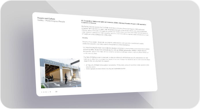 People and Culture U.S. Occupational Safety and Health Administration (OSHA) Voluntary Protection Program (VPP) application Safety – Protecting our People accepted in GF Nevada Gigafactory Nevada became the first Tesla site to have a Voluntary Protection Program (VPP) application accepted. VPP is an OSHA program that recognizes employers in the private industry who have implemented effective safety and health management systems and maintain injury and illness rates below national Bureau of Labor Statistics averages for their respective industries. Next step will be a rigorous onsite evaluation by a team of health and safety professionals in May 2022. Security Security of our people, the planet, our property and products continues to be a core factor to enable production execution and build capacity throughout our entire organization. Our manufacturing locations have dedicated physical and technical security teams, while at our service centers and remote sites, we augment physical security with our SHIELD ambassadors. SHIELD is Tesla's Security Ambassador project that helps increase security awareness at all Tesla locations, especially those without an on-site security team. The Tesla SHIELD program is designed to educate individuals with the basic security requirements for their building, to allow them to present the issues to their site manager for resolution and be able to escalate larger issues to the Security Team for support. • 271 Security SHIELD Ambassadors registered at 176 locations across 24 countries to help support on-site security needs • 37,154 workers trained in basic security and awareness courses 50