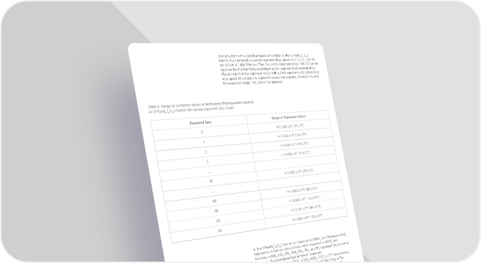 Similarly, for normalized floating point numbers in the CFloat8_1_5_2 format, the numerical values for exponent bias values of 0, 1, 2, 3,…, 62, 63 are shown in Table 5 below. Thus, the entire exponent range [-62, 31] can be spanned by this format by reconfiguring the exponent bias appropriately. Please note that the exponent range with a 5-bit exponent with a fixed bias only spans 31 consecutive exponent values. For example, for bias = 31, only the exponent range [-30, 0] can be spanned. Table 5: Range of numerical values of normalized floating-point numbers in CFloat8_1_5_2 format for various exponent bias values Exponent Bias Range of Numerical Values 1 31 0 +/-[1.00 x 2, 1.11 x 2 ] 0 30 1 +/-[1.00 x 2 , 1.11 x 2 ] -1 29 2 +/-[1.00 x 2 , 1.11 x 2 ] -2 28 3 +/-[1.00 x 2 , 1.11 x 2 ] ... -30 0 31 +/-[1.00 x 2 , 1.11 x 2 ] ... -59 -29 60 +/-[1.00 x 2 , 1.11 x 2 ] -60 -30 61 +/-[1.00 x 2 , 1.11 x 2 ] -61 -31 62 +/-[1.00 x 2 , 1.11 x 2 ] -62 -32 63 +/-[1.00 x 2 , 1.11 x 2 ] In the CFloat8_1_4_3 format, an Exponent = 0000 and Mantissa = 000 2 2 represents numerical value of Zero, while Exponent = 0000 and 2 Mantissa = 001 , 010 , 011 , 100 , 101 , 110 , and 111 represent the denormal 2 2 2 2 2 2 2 numbers. The corresponding numerical values are -bias +/- {0.001 , 0.010 , 0.011 , 0.100 , 0.101 , 0.110 , 0.111 } x 2 respectively, 2 2 2 2 2 2 2 where bias is the 6-bit exponent bias from 0 to 63. Similarly, in the CFloat8_1_5_2 format, an Exponent = 00000 and Mantissa = 00 2 2 represents numerical value of Zero, while Exponent = 00000 and 2 Mantissa =01 , 10 , and 11 represent the denormal numbers. The 2 2 2 -bias corresponding numerical values are +/- {0.01 , 0.10 , 0.11 } x 2 2 2 2 respectively, where bias is the 6-bit exponent bias from 0 to 63. Gradual underflow with denormal handling is supported in both CFloat8_1_4_3 and CFloat8_1_5_2 formats. These formats have limited exponent range, and the denormal number support helps increase the representable numeric range. The 6-bit bias is chosen as an unsigned integer to skew the range of representable values more on the smaller numeric values at the expense of larger numerical values, as the parameters in the deep learning neural networks are normalized within some [-N,N] bound where N is an integer, and thus tend to span very small numerical values. 06 Tesla Dojo Technology — A Guide to Tesla’s Configurable Floating Point Formats & Arithmetic