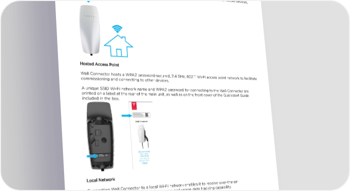 PRODUCT OVERVIEW Features Connectivity Wall Connector is equipped with Wi-Fi to communicate with local site routers, vehicles, mobile devices, other Wall Connectors, and other Tesla products. Hosted Access Point Wall Connector hosts a WPA2 password-secured, 2.4 GHz, 802.11 Wi-Fi access point network to facilitate commissioning and connecting to other devices. A unique SSID Wi-Fi network name and WPA2 password for connecting to the Wall Connector are printed on a label at the rear of the main unit, as well as on the front cover of the Quickstart Guide included in the box. Local Network Connecting Wall Connector to a local Wi-Fi network enables it to receive over-the-air firmware updates, remote diagnostics access, and usage data tracking capability. Wall Connector only supports WPA2/3-secured, 2.4 GHz, 802.11 infrastructure mode networks. NOTE: Hidden networks are supported. NOTE: WPA enterprise will be supported in a future firmware update. Gen 3 Wall Connector Manual 7