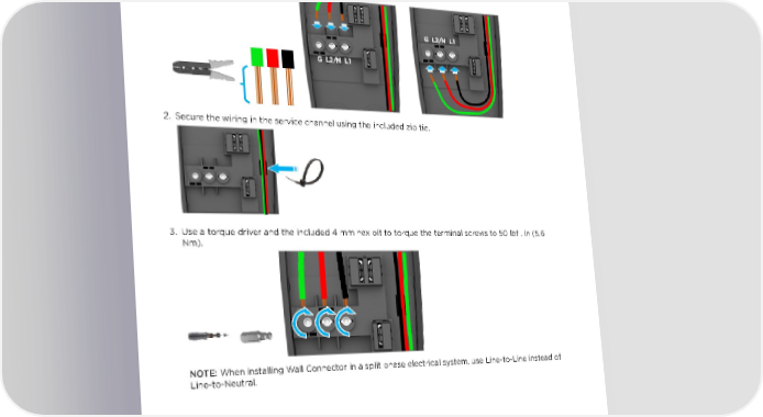 INSTALLATION Step 5: Strip and Land Wiring 1. Strip insulation from wires ~1/2 in (~13 mm), route through service channel, and land each wire in its correct terminal block. NOTE: Terminals are bi-directional. 2. Secure the wiring in the service channel using the included zip tie. 3. Use a torque driver and the included 4 mm hex bit to torque the terminal screws to 50 lbf . in (5.6 Nm). NOTE: When installing Wall Connector in a split phase electrical system, use Line-to-Line instead of Line-to-Neutral. 20 Gen 3 Wall Connector Manual