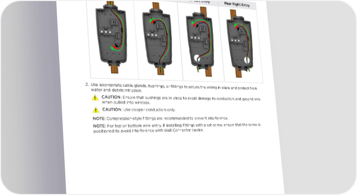 INSTALLATION Step 4: Route Wiring Through Wirebox 1. Route wiring into selected entry point and through the service loop channel on the right side of the wirebox. Top Entry Bottom Entry Rear Left Entry Rear Right Entry 2. Use appropriate cable glands, bushings, or fittings to secure the wiring in place and protect from water and debris intrusion. CAUTION: Ensure that bushings are in place to avoid damage to conductors and ground wire when pulled into wirebox. CAUTION: Use copper conductors only. NOTE: Compression-style fittings are recommended to prevent interference. NOTE: For top or bottom wire entry, if installing fittings with a set screw, ensure that the screw is positioned to avoid interference with Wall Connector cables. Gen 3 Wall Connector Manual 19