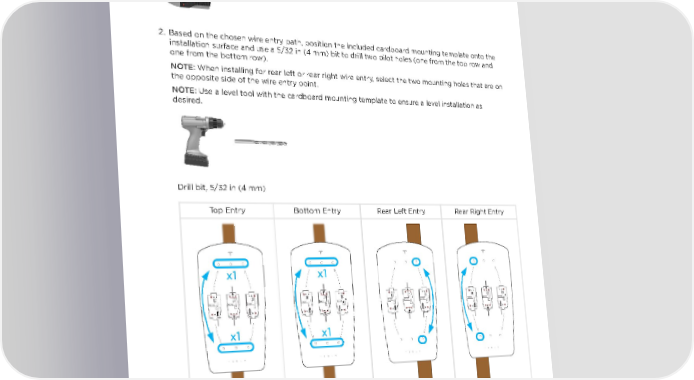 INSTALLATION Step 2: Prepare Mounting Surface 1. If applicable, use a stud finder to locate a wooden support stud. Plywood, or other flat wall surfaces capable of supporting the weight of the Wall Connector, may also be used. 2. Based on the chosen wire entry path, position the included cardboard mounting template onto the installation surface and use a 5/32 in (4 mm) bit to drill two pilot holes (one from the top row and one from the bottom row). NOTE: When installing for rear left or rear right wire entry, select the two mounting holes that are on the opposite side of the wire entry point. NOTE: Use a level tool with the cardboard mounting template to ensure a level installation as desired. Drill bit, 5/32 in (4 mm) Top Entry Bottom Entry Rear Left Entry Rear Right Entry Gen 3 Wall Connector Manual 17