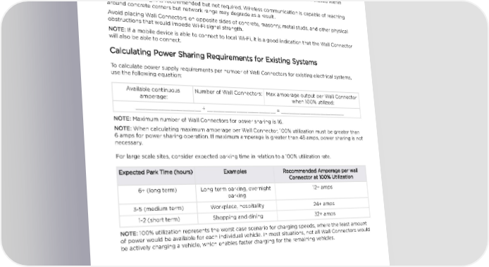 POWER SHARING Considerations for Power Sharing Wall Connector power sharing is achieved wirelessly. For optimal performance, Wall Connectors within a power sharing network should be installed within view of each other whenever possible. NOTE: Line of sight is recommended but not required. Wireless communication is capable of reaching around concrete corners but network range may degrade as a result. Avoid placing Wall Connectors on opposite sides of concrete, masonry, metal studs, and other physical obstructions that would impede Wi-Fi signal strength. NOTE: If a mobile device is able to connect to local Wi-Fi, it is a good indication that the Wall Connector will also be able to connect. Calculating Power Sharing Requirements for Existing Systems To calculate power supply requirements per number of Wall Connectors for existing electrical systems, use the following equation: Available continuous Number of Wall Connectors: Max amperage output per Wall Connector amperage: when 100% utilized: _____________________ รท ________________________ = ________________________ NOTE: Maximum number of Wall Connectors for power sharing is 16. NOTE: When calculating maximum amperage per Wall Connector, 100% utilization must be greater than 6 amps for power sharing operation. If maximum amperage is greater than 48 amps, power sharing is not necessary. For large scale sites, consider expected parking time in relation to a 100% utilization rate. Expected Park Time (hours) Examples Recommended Amperage per wall Connector at 100% Utilization 6+ (long term) Long term parking, overnight 12+ amps parking 3-5 (medium term) Workplace, hospitality 24+ amps 1-2 (short term) Shopping and dining 32+ amps NOTE: 100% utilization represents the worst case scenario for charging speeds, where the least amount of power would be available for each individual vehicle. In most situations, not all Wall Connectors would be actively charging a vehicle, which enables faster charging for the remaining vehicles. Gen 3 Wall Connector Manual 25