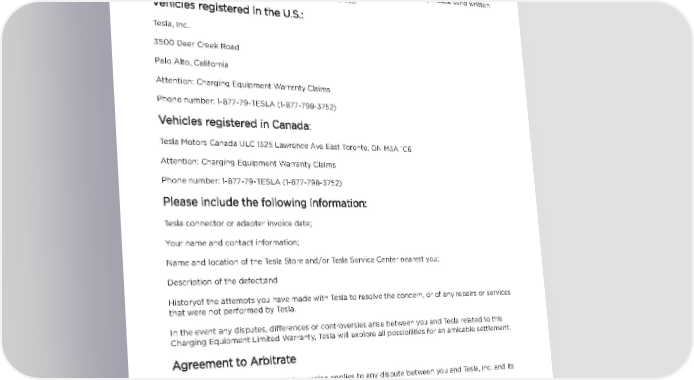 WARRANTY INFORMATION Dispute Resolution To the fullest extent allowed by local law, Tesla requires that you first provide written notification of any manufacturing defect within a reasonable time, and within the applicable coverage period specified in this Charging Equipment Limited Warranty, and allow Tesla an opportunity to make any needed repairs before submitting a dispute to our dispute settlement program (described below). Please send written notification on dispute resolution to the following address: Vehicles registered in the U.S.: Tesla, Inc. 3500 Deer Creek Road Palo Alto, California Attention: Charging Equipment Warranty Claims Phone number: 1-877-79-TESLA (1-877-798-3752) Vehicles registered in Canada: Tesla Motors Canada ULC 1325 Lawrence Ave East Toronto, ON M3A 1C6 Attention: Charging Equipment Warranty Claims Phone number: 1-877-79-TESLA (1-877-798-3752) Please include the following information: Tesla connector or adapter invoice date; Your name and contact information; Name and location of the Tesla Store and/or Tesla Service Center nearest you; Description of the defect;and Historyof the attempts you have made with Tesla to resolve the concern, or of any repairs or services that were not performed by Tesla. In the event any disputes, differences or controversies arise between you and Tesla related to this Charging Equipment Limited Warranty, Tesla will explore all possibilities for an amicable settlement. Agreement to Arbitrate Please carefully read this provision, which applies to any dispute between you and Tesla, Inc. and its affiliates (together “Tesla”). If you have a concern or dispute, please send a written notice describing it and your desired resolution to [email protected]. If not resolved within 60 days, you agree that any dispute arising out of or relating to any aspect of the relationship between you and Tesla will not be decided by a judge or jury but instead by a single arbitrator in an arbitration administered by the American Arbitration Association (AAA) under its Consumer Arbitration Rules. This includes claims arising before this Charging Equipment Limited Warranty, such as claims related to statements about our products. Gen 3 Wall Connector Manual 31