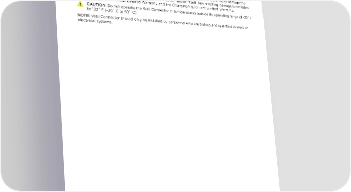 IMPORTANT SAFETY INFORMATION CAUTIONS CAUTION: Do not use private power generators as a power source for charging. CAUTION: Incorrect installation and testing of the Wall Connector could potentially damage the vehicle's battery, components, and/or the Wall Connector itself. Any resulting damage is excluded from the New Vehicle Limited Warranty and the Charging Equipment Limited Warranty. CAUTION: Do not operate the Wall Connector in temperatures outside its operating range of -22˚ F to 122˚ F (-30˚ C to 50˚ C). NOTE: Wall Connector should only be installed by personnel who are trained and qualified to work on electrical systems. Gen 3 Wall Connector Manual 3