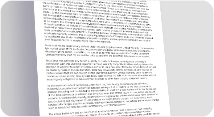 WARRANTY INFORMATION Limits of Liability This Charging Equipment Limited Warranty is the only express warranty made in connection with your Tesla connector or adapter. Implied and express warranties and conditions arising under applicable local laws, federal statute or otherwise, in law or in equity, if any, including, but not limited to, implied warranties and conditions of merchantability or merchantable quality, fitness for a particular purpose, durability, or those arising by a course of dealing or usage of trade, or any warranties against latent or hidden defects, are disclaimed to the fullest extent allowable by your local law, or limited in duration to the term of this Charging Equipment Limited Warranty. To the fullest extent allowable by your local law, the performance of necessary repairs and/or replacement of new, reconditioned, or remanufactured parts by Tesla for the covered defects is the exclusive remedy under this Charging Equipment Limited Warranty or any implied warranties. To the maximum extent permissible under your local law, liability is limited to the reasonable price for repair or replacement of the applicable Tesla connector or adapter, not to exceed the manufacturerƒs suggested retail price. Replacement may be made with parts of like kind and quality, including non-original manufacturerƒs parts, or reconditioned or remanufactured parts, as necessary. This Charging Equipment Limited Warranty covers only parts and factory labor necessary to repair but does not include any on-site labor costs related to un-installing, reinstalling or removing the repaired or replacement charging equipment. Parts repaired or replaced, including replacement of a Tesla connector or adapter, under this Charging Equipment Limited Warranty are covered only until the applicable warranty period of this Charging Equipment Limited Warranty ends, or as otherwise provided by applicable law. Under no circumstances will the original warranty period be extended as a result of your Tesla connector or adapter being repaired or replaced. Tesla shall not be liable for any defects under this Charging Equipment Limited Warranty that exceed the fair market value of the applicable Tesla connector or adapter at the time immediately preceding the discovery of the defect. In addition, the sum of all benefits payable under this Charging Equipment Limited Warranty shall not exceed the price you paid for the applicable Tesla connector or adapter. Tesla does not authorize any person or entity to create for it any other obligations or liability in connection with this Charging Equipment Limited Warranty. Subject to local laws and regulations, the decision of whether to repair or replace a part or to use a new, reconditioned or remanufactured part will be made by Tesla, in its sole discretion. Tesla may occasionally offer to pay some or all of the cost of certain repairs that are not covered by this Charging Equipment Limited Warranty, either for specific models or on an ad hoc, case-by-case basis. Tesla reserves the right to do the above at any time without incurring any obligation to make a similar payment to other Tesla charging equipment owners. To the maximum extent permissible under local law, Tesla hereby disclaims any and all indirect, incidental, special and consequential damages arising out of, or relating to, the Tesla connector or adapter, including, but not limited to, transportation to and from a Tesla Authorized Service Center, loss of the Tesla connector or adapter, loss of vehicle value, loss of time, loss of income, loss of use, loss of personal or commercial property, inconvenience or aggravation, emotional distress or harm, commercial loss (including but not limited to lost profits or earnings), towing charges, bus fares, vehicle rental, service call charges, gasoline expenses, lodging expenses, damage to tow vehicle, and incidental charges such as telephone calls, facsimile transmissions, and mailing expenses. The above limitations and exclusions shall apply whether your claim is in contract, tort (including negligence and gross negligence), breach of warranty or condition, misrepresentation (whether negligent or otherwise), or otherwise at law or in equity, even if Tesla is advised of the possibility of such damages or such damages are reasonably foreseeable. Nothing in this Charging Equipment Limited Warranty shall exclude, or in any way limit, Teslaƒs liability for death or personal injury solely and directly caused by Teslaƒs negligence, or that of its employees, agents or sub-contractors (as applicable), fraud or fraudulent misrepresentation, or any other liability to the extent the same is proven in a court of competent jurisdiction in a final nonappealable judgment and may not be excluded or limited as a matter of local law. 30 Gen 3 Wall Connector Manual