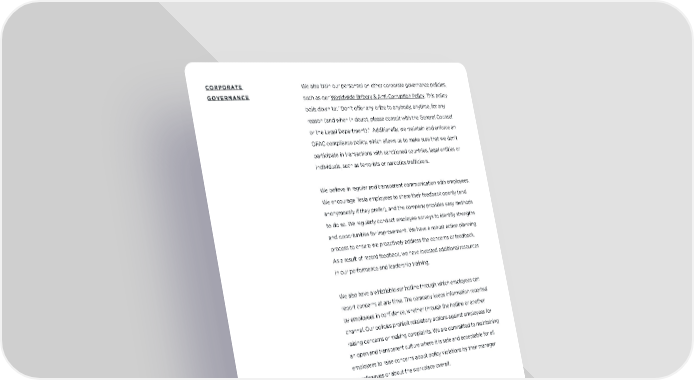 CORPORATE We also train our personnel on other corporate governance policies, GOVERNANCE such as our Worldwide Bribery & Anti-Corruption Policy. This policy boils down to: “Don’t o!er any bribe to anybody, anytime, for any reason (and when in doubt, please consult with the General Counsel or the Legal Department).” Additionally, we maintain and enforce an OFAC compliance policy, which allows us to make sure that we don’t participate in transactions with sanctioned countries, legal entities or individuals, such as terrorists or narcotics traffickers. We believe in regular and transparent communication with employees. We encourage Tesla employees to share their feedback openly (and anonymously if they prefer), and the company provides easy methods to do so. We regularly conduct employee surveys to identify strengths and opportunities for improvement. We have a robust action planning process to ensure we proactively address the concerns or feedback. As a result of recent feedback, we have invested additional resources in our performance and leadership training. We also have a whistleblower hotline through which employees can report concerns at any time. The company keeps information reported by employees in confidence, whether through the hotline or another channel. Our policies prohibit retaliatory actions against employees for raising concerns or making complaints. We are committed to maintaining an open and transparent culture where it is safe and acceptable for all employees to raise concerns about policy violations by their manager or colleagues or about the workplace overall. 46