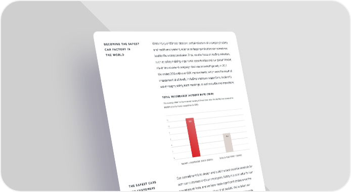 BECOMING THE SAFEST While injury and illness rates are useful indicators of a company’s safety CAR FACTORY IN and health environment, reliance on lagging indicators can sometimes THE WORLD lead to the wrong conclusion. Thus, we also focus on leading indicators, such as safety training, ergonomic opportunities and our global “Find-it; Fix-it” improvement campaign that was kicked o! globally in 2017. We ended 2018 with over 60K improvements, which were the result of engagement at all levels, including employee suggestions, leadership walkthroughs, safety team meetings, as well as audits and inspections. TOTAL RECORDABLE INCIDENT RATE (TRIR) The average TRIR for the Fremont Factory is lower than when the facility was operated as NUMMI prior to Tesla’s acquisition in 2010. 12 12.6 10 8 6 6.2 4 2 0 NUMMI (AVERAGE 2003-2009) TESLA FACTORY (2018) THE SAFEST CARS Our commitment is to design and build the best possible products for FOR CUSTOMERS both our customers and our employees. Safety is a core value for our AND EMPLOYEES operations at Tesla, and we have made significant strides since the days of ramping production of our first models. We’ve taken our learnings from building Model S and Model X and applied them to designing the manufacturing process for Model 3. Tesla’s ergonomics team was heavily involved in the development of Model 3 assembly lines by using a virtual reality program to study the exact movements that would be used by our employees when building the car. This e!ort significantly improved ergonomics on the Model 3 assembly line by reducing potential stresses and strains. IMPACT REPORT 37
