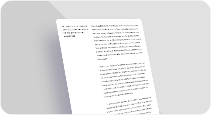 INTEGRATE — TO CONNECT Diversity and inclusion is integrated into our business, recruiting and the DIVERSITY AND INCLUSION communities in which we work. Our leaders review their demographics TO THE BUSINESS AND and create business action plans in order to continue to lead an inclusive EMPLOYEES workforce. We require a diverse interview panel to reflect the diversity of our candidates, and provide our recruiting team with unconscious bias training to uncover and mitigate their biases when reviewing potential Tesla candidates. We also partner with the Public Workforce Systems, a network of U.S. federal, state and local offices that support economic expansion and development of the U.S.’s workforce, to train and recruit diverse talent. These partners include the Department of Veteran’s A!airs, Department of Social Services, Department of Labor, Department of Education and various government agencies and community resources. Tesla also has collaborative partnerships with organizations utilizing The Workforce Innovation and Opportunity Act (WIOA), an initiative that provides employment services, develops career pathways, training programs and talent pipelines. WIOA provides U.S. federal funds to eligible community- based organizations to help job seekers, workers and businesses with career services, job training and education. Our production leads reflect the diversity of the Fremont Factory, with over two-thirds identifying as Asian, Hispanic/Latino, African American or Other. Having a diverse workforce is only one piece of our impact as an organization. We know that our suppliers and those that we do business with also impact the communities that we serve. We have many diverse suppliers in our portfolio, and we require all vendors to abide by our Code and to understand our commitment to diversity. We also participate in outreach events with certified diverse suppliers to continue to broaden the range of our vendor base, such as the California Public Utilities Commission’s Small and Diverse Business Expo. IMPACT REPORT 41