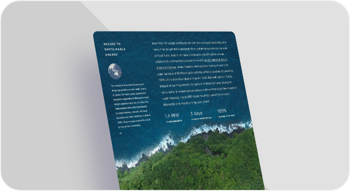 ACCESS TO More than 1B people worldwide do not have access to electricity, and SUSTAINABLE many that do get their electricity from polluting sources such as coal ENERGY or fossil fuels. Tesla is bringing sustainable and a!ordable energy solutions to communities around the world. On the island of Ta’u in American Samoa, Tesla created a microgrid consisting of over 5.3K solar panels and 60 Powerpack systems, which is capable of powering 100% of the island on clean energy for 3 full days without sun. Today, Ta’u Island in American Samoa used diesel generators as their main source instead of burning almost 110K gallons of diesel per year, paying for of power for many years, leaving the rising fuel and related transportation costs and having to face negative residents vulnerable to blackouts when health impacts, nearly 900 residents of Ta’u benefit from clean, diesel supplies were low. To solve this, Tesla paired solar with Powerpacks a!ordable and reliable energy year round. to power homes, schools, the local hospital and other facilities to deliver 1.4 MW 3 days 100% 100% clean energy around the clock to the entire community. of solar generation of energy without the sun coverage of the island 12