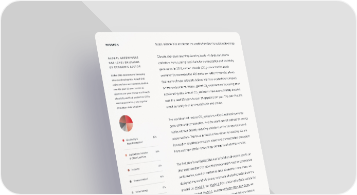 MISSION Tesla’s mission is to accelerate the world’s transition to sustainable energy. GLOBAL GREENHOUSE Climate change is reaching alarming levels – in large part due to GAS (GHG) EMISSIONS emissions from burning fossil fuels for transportation and electricity BY ECONOMIC SECTOR generation. In 2016, carbon dioxide (CO2) concentration levels Global GHG emissions are increasing permanently exceeded the 400 parts per million threshold, a level at an accelerating rate. Annual GHG emissions have approximately doubled that many climate scientists believe will have a catastrophic impact over the past 50 years to over 35 on the environment. Worse, global CO emissions are increasing at an gigatons per year. Energy use through 2 electricity and heat production (25%) accelerating rate. Annual CO2 emissions have approximately doubled and transportation (14%) together over the past 50 years to over 35 gigatons per year. The path that the drive these GHG emissions. world currently is on is unsustainable and unwise. The world cannot reduce CO emissions without addressing energy 2 generation and consumption. And the world cannot address its energy habits without directly reducing emissions in the transportation and Electricity & 25% Heat Production* power sectors. This issue is Tesla’s entire reason for existing. We are focused on creating a complete power and transportation ecosystem Agriculture, Forestry 24% from solar generation and energy storage to all-electric vehicles. & Other Land Use Industry 21% The first step in our Master Plan was to build an all-electric sports car (the Tesla Roadster) to prove that people didn’t need to compromise Transportation* 14% performance, speed or comfort to drive all-electric. From there, we Other Energy 10% designed the world’s first-ever premium all-electric sedan from the ground up, Model S, our Model X SUV, and an a!ordable vehicle for Buildings 6% the mass market, Model 3. As part of Master Plan, Part Deux, we *Tesla-related sectors introduced Tesla Semi, an all-electric truck that delivers massive savings in energy costs, performance, efficiency and reliability. 04