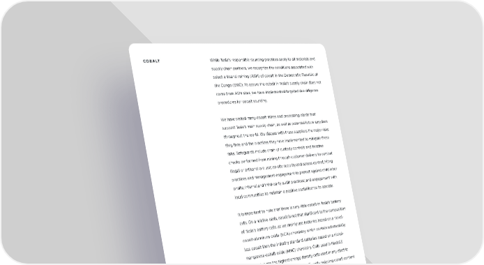 COBALT While Tesla’s responsible sourcing practices apply to all materials and supply chain partners, we recognize the conditions associated with select artisanal mining (ASM) of cobalt in the Democratic Republic of the Congo (DRC). To assure the cobalt in Tesla’s supply chain does not come from ASM sites, we have implemented targeted due diligence procedures for cobalt sourcing. We have visited many cobalt mines and processing plants that support Tesla’s main supply chain, as well as potential future suppliers throughout the world. We discuss with these suppliers the major risks they face and the practices they have implemented to mitigate these risks. Safeguards include chain of custody controls and iterative checks performed from mining through customer delivery to combat illegal or artisanal ore use; on-site security and access control; hiring practices and management engagement to protect against child labor onsite; internal and third-party audit practices; and engagement with local communities to maintain a positive social license to operate. It is important to note that there is very little cobalt in Tesla’s battery cells. On a relative basis, cobalt is not that significant to the composition of Tesla’s battery cells, as we mainly use batteries based on a nickel- cobalt-aluminum oxide (NCA) chemistry, which contain substantially less cobalt than the industry standard batteries based on a nickel- manganese-cobalt oxide (NMC) chemistry. Cells used in Model 3 production are the highest energy density cells used in any electric vehicle. We have achieved this by significantly reducing cobalt content per battery pack while increasing nickel content and still maintaining superior thermal stability. The cobalt content of NCA cathode chemistry is already lower than next-generation cathodes that will be made by traditional battery cell producers with an NMC ratio of 8:1:1. Thus, Tesla not only uses far less cobalt per vehicle than the rest of the electric vehicle industry but also plans to recycle and reuse the cobalt at these batteries’ end of life. Tesla continues to look for ways to reduce the amount of cobalt used in our battery cells with a goal of eliminating it entirely. IMPACT REPORT 33