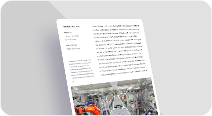FREMONT FACTORY Tesla purchased the Fremont plant in 2010 and completed a significant $3 billion modernization of the site to create one of the most advanced PRODUCT manufacturing facilities in the world. Originally built in the 1960s, the 1 MW / 2 MWh Fremont Factory contains 5.3M sq ft of manufacturing and office Powerpack Battery space — the equivalent of over 90 American football fields. The original APPLICATION roof layout and building infrastructure make solar deployment on-site Peak Shaving challenging, but our long-term plan is to install rooftop solar panels at this site where possible. The Fremont Factory is also home to one of our first battery installations, originally commissioned in 2015. The Tesla builds every Model S, Model X and Fremont Factory battery pack system monitors the facility’s energy Model 3 at its factory in Fremont, where some vehicle components are also use throughout the day and cuts back the amount of electricity taken manufactured. In addition to the 10K+ from the grid during peak hours. This also helps to decrease demand employees at this factory, hundreds of on the local electric grid in addition to reducing the facility’s energy robots are located throughout the facility, including on the Model 3 production line. costs, as electricity purchased during peak hours is priced at a premium. 18
