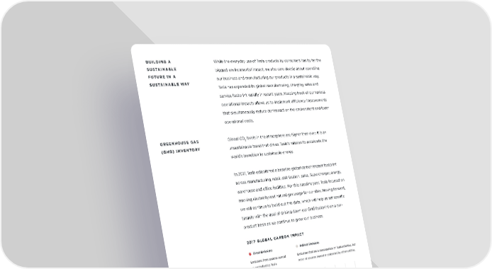 BUILDING A While the everyday use of Tesla products by consumers has by far the SUSTAINABLE biggest environmental impact, we also care deeply about operating FUTURE IN A our business and manufacturing our products in a sustainable way. SUSTAINABLE WAY Tesla has expanded its global manufacturing, charging, sales and service footprint rapidly in recent years. Keeping track of our various operational impacts allows us to implement efficiency improvements that simultaneously reduce our impact on the environment and lower operational costs. GREENHOUSE GAS Global CO2 levels in the atmosphere are higher than ever. It is an (GHG) INVENTORY unsustainable trend that drives Tesla’s mission to accelerate the world’s transition to sustainable energy. In 2017, Tesla established a baseline global carbon impact footprint across manufacturing, retail, distribution, sales, Supercharger, energy, warehouse and office facilities. For this baseline year, Tesla focused on tracking electricity and natural gas usage for our sites. Moving forward, we will continue to build out this data, which will help us set specific targets with the goal of driving down our GHG footprint on a per- product basis as we continue to grow our business. 2017 GLOBAL CARBON IMPACT Direct Emissions Indirect Emissions Emissions from sources owned Emissions that are a consequence of Tesla activities, but or controlled by Tesla occur at sources owned or controlled by other entities. SUPERCHARGER 64 NETWORK SALES, SERVICE 39 & DELIVERY ENERGY 33 OPERATIONS FACILITIES 146 THOUSAND METRIC TONS (CO2e) 0 20 40 60 80 100 120 140 16