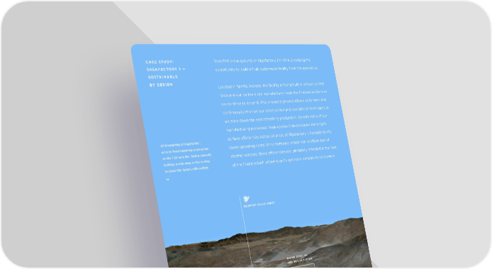 CASE STUDY: Tesla first broke ground on Gigafactory 1 in 2014, providing the GIGAFACTORY 1 — opportunity to build a truly sustainable facility from the ground up. SUSTAINABLE BY DESIGN Located in Sparks, Nevada, the facility is being built in phases so that Tesla and our partners can manufacture inside the finished sections as we continue to expand. This phased approach allows us to learn and continuously improve our construction and operational techniques as we drive down the cost of battery production. As with many of our manufacturing processes, Tesla applies first-principles thinking to 2014 rendering of Gigafactory 1, achieve efficiencies across all areas of Gigafactory 1, translating into prior to Tesla beginning construction lower operating costs. Since batteries remain the costliest part of on the 3.2K-acre site. Tesla is currently electric vehicles, these efficiencies are ultimately reflected in the cost building a solar array on the rooftop to power the factory with sunlight. of the final product, allowing us to get more vehicles to consumers. ROOFTOP SOLAR ARRAY WATER STORAGE AND RE-USE SYSTEM IMPIMPAACT REPORTCT REPORT 27