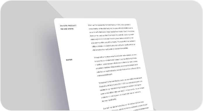 ON-SITE PRODUCT When we first opened the Fremont Factory in 2010, Tesla operations RE-USE STORE were a fraction of the total footprint. As areas within the facility expand, we send parts that are no longer needed to an onsite “store” where these items can be used by other Tesla teams. For example, surplus eye-wash station signs from the Fremont Factory were made available to a new area opening within our Lathrop facility. This reuse e!ort has resulted in millions of dollars in avoided costs, and contributes significantly to our e!orts to divert as much waste as possible from landfills. WATER Through efficiency improvements and water reuse systems, we work to lower the per-product water usage in our manufacturing process. In addition, water reduction e!orts are included in our sales, service and delivery facilities. Where possible, our service technicians use a waterless car wash method to maintain Tesla vehicles while minimizing environmental impacts. Throughout the Fremont Factory, water use per vehicle manufactured dropped by 9% from 2016 to 2017. In 2017, we established a water-use baseline for our manufacturing and support operations. During the 3 same period, global water use was 8.77 m per vehicle. As we increase production in coming years, we expect water use per vehicle to decrease significantly. Our main manufacturing facilities are not only looking to increase water-use efficiencies, but also to improve wastewater and stormwater management. These projects include reverse osmosis and distilled water system installations to improve water quality and to allow existing water sources to be recycled and reused in other processing areas such as the closed-loop system of our facilities’ cooling towers. Projects in development include water mapping to identify opportunities for either recycling or increased passes in our closed-loop systems as well as leak identification. At Gigafactory 2, Tesla is dedicated to making our production activities supportive of the comprehensive cleanup and transformation of the Bu!alo River and to ensure the waterway remains a rich environmental, economic and community resource. IMPACT REPORT 25