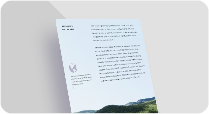RESILIENCE Solar and energy storage systems don’t just provide clean, zero- OF THE GRID emission energy, they also improve the reliability and resilience of the electric grid. For example, in the event of an electric grid outage, energy storage systems can immediately provide power to homes, communities and businesses. When Hurricane Maria struck Puerto Rico in September 2017, destroying thousands of homes and cutting electric grid power on the island, the initial emergency response was focused on deploying diesel generators to provide temporary electricity. In addition to releasing harmful emissions and requiring constant refueling and maintenance, these generators were extremely loud and not designed to run for long periods, so many failed. In response, Tesla provided over 1K battery Tesla batteries combined with existing storage systems paired with solar panels to deliver reliable and solar arrays on the island of Culebra in emissions-free electricity to over 660 locations throughout Puerto Rico, Puerto Rico provide clean energy for communities nearby. such as the Hospital del Niño Children’s Hospital in San Juan. 10