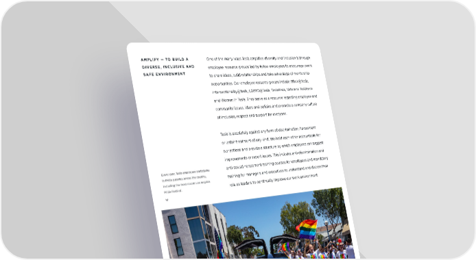 AMPLIFY — TO BUILD A One of the many ways Tesla amplifies diversity and inclusion is through DIVERSE, INCLUSIVE AND employee resource groups led by fellow employees to encourage peers SAFE ENVIRONMENT to share ideas, build relationships and take advantage of mentorship opportunities. Our employee resource groups include: Black@Tesla, Intersectionality@Tesla, LGBTQ@Tesla, Teslatinos, Veterans Taskforce and Women In Tesla. They serve as a resource regarding employee and community issues, ideas and policies and promote a company culture of inclusion, respect and support for everyone. Tesla is absolutely against any form of discrimination, harassment or unfair treatment of any kind. We hold each other accountable for our actions and provide a structure by which employees can suggest improvements or report issues. This includes anti-discrimination and Every year, Tesla employees participate anti-sexual harassment training courses for employees and mandatory in Pride parades across the country, training for managers and executives to understand and discuss their including the most recent Los Angeles Pride Festival. role as leaders to continually improve our work environment. 40