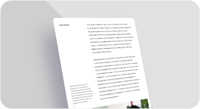 EDUCATION Tesla partners with local high schools, universities and nonprofits to accelerate the world’s transition to sustainable energy and address the growing demand for science, technology, engineering and mathematics (STEM) jobs. Utilizing student grade-specific activities, Tesla has increased access for students in California to early professional experiences by providing career exposure workshops, STEM/STEAM hands-on activities, factory tours, and speaking opportunities at facilities and local community events, including at the Community Youth Center of San Francisco. In Nevada, growth in STEM jobs is projected to be 40% higher than in non-STEM jobs between 2014-2024. To prepare students for manufacturing and engineering careers at Tesla and other companies, Tesla is investing $37.5M in Nevada K-12 education over the next 5 years – a commitment we made in 2014 when we finalized plans to locate Gigafactory 1 in Sparks. As part of our workforce development, Tesla also launched a high school graduate apprenticeship, the Nevada high school students tour Gigafactory 1 as part of Tesla’s new Manufacturing Development Program, to educate and recruit talent Manufacturing Development Program — from diverse high schools across the state to become Production an apprenticeship designed to accelerate high school graduates’ careers by giving Associates at Gigafactory 1. In the last two years, we hosted over them full-time employment at Tesla and 250 educational tours of Gigafactory 1 for more than 3K students, opportunities to receive credits from a nearby community college. teachers and administrators. 44