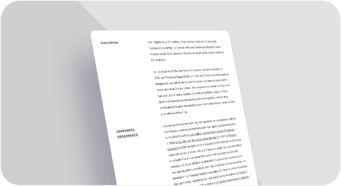 EDUCATION Near Gigafactory 2 in Bu!alo, Tesla partners with Erie Community College and local high schools for the Solar Pathways Program, which exposes students to careers in the energy sector and creates a pipeline for local jobs. To put students at the forefront of the electric vehicle revolution, in 2018, we introduced Tesla START, an intensive 12-week training program designed to provide students with the skills necessary to jump start a career at a Tesla Service Center. The program is currently running in the San Jose, Los Angeles, Seattle, Charlotte, and Miami regions, where dozens of students are developing technical expertise and earning certificates through a blended approach of in-class theory, hands-on labs and self-paced learning. CORPORATE Our Board of Directors sets high standards for our employees, officers GOVERNANCE and directors, and we periodically add new, highly qualified directors to the Board, such as Larry Ellison and Kathleen Wilson-Thompson in 2018, Linda Johnson Rice and James Murdoch in 2017 and Robyn Denholm in 2014. Implicit in this philosophy is the importance of sound corporate governance to help us achieve our goals. We are committed to establishing an operating framework that exercises appropriate oversight of responsibilities at all levels throughout the company and manages its a!airs consistent with high principles of business ethics. As detailed on our Investor Relations website, we have a number of policies that set the high standards we hold ourselves to, including our Code of Business Conduct and Ethics and our Corporate Governance Guidelines. IMPACT REPORT 45