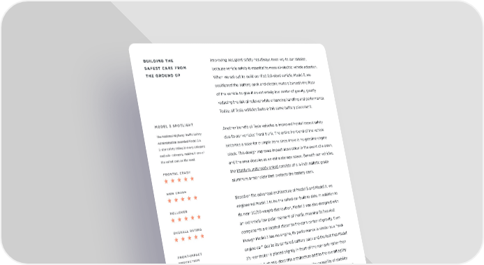 BUILDING THE Improving occupant safety has always been key to our mission, SAFEST CARS FROM because vehicle safety is essential to mass all-electric vehicle adoption. THE GROUND UP When we set out to build our first full-sized vehicle, Model S, we positioned the battery pack and electric motors beneath the floor of the vehicle to give it an extremely low center of gravity, greatly reducing the risk of rollover while enhancing handling and performance. Today, all Tesla vehicles feature this same battery placement. MODEL 3 SPOTLIGHT Another benefit of Tesla vehicles is improved frontal impact safety The National Highway Traffic Safety Administration awarded Model 3 a due to our vehicles’ front trunk. The entire front end of the vehicle 5-star safety rating in every category becomes a superior crumple zone since there is no gasoline engine and sub- category, making it one of block. This design improves impact absorption in the event of a crash, the safest cars on the road. and the area doubles as an extra storage space. Beneath our vehicles, FRONTAL CRASH the titanium underbody shield consists of a ¼-inch ballistic grade aluminum armor plate that protects the battery pack. SIDE CRASH Based on the advanced architecture of Model S and Model X, we ROLLOVER engineered Model 3 to be the safest car built to date. In addition to its near 50/50 weight distribution, Model 3 was also designed with OVERALL RATING an extremely low polar moment of inertia, meaning its heaviest components are located closer to the car’s center of gravity. Even though Model 3 has no engine, its performance is similar to a “mid- FRONT-IMPACT engine car” due to its centered battery pack and the fact that Model PROTECTION 3’s rear motor is placed slightly in front of the rear axle rather than SIDE-IMPACT behind it. Not only does this architecture add to the overall agility PROTECTION and handling of the car, it also improves the capability of stability LOWEST control by minimizing rotational kinetic energy. After testing Model 3 ROLLOVER RISK as part of its New Car Assessment Program through a series of crash tests used to calculate the likelihood of serious bodily injury for front, side and rollover crashes, the National Highway Traffic Safety Administration (NHTSA) awarded Model 3 a perfect 5-star safety rating in every category and sub-category. IMPACT REPORT 13