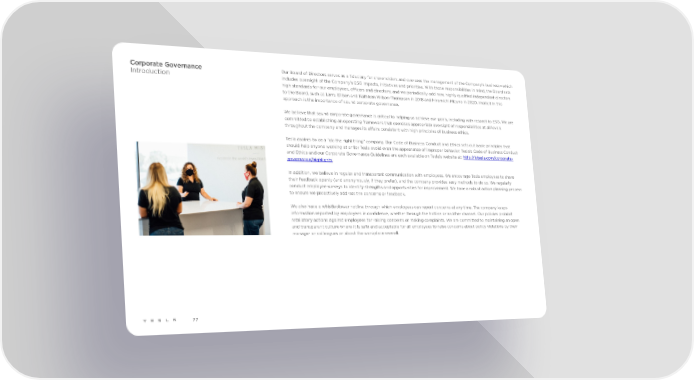 Corporate Governance Our Board of Directors serves as a fiduciary for shareholders and oversees the management of the Company's business—which Introduction includes oversight of the Company’s ESG impacts, initiatives and priorities. With those responsibilities in mind, the Board sets high standards for our employees, officers and directors; and we periodically add new, highly qualified independent directors to the Board, such as Larry Ellison and Kathleen Wilson-Thompson in 2018 and Hiromichi Mizuno in 2020. Implicit in this approach is the importance of sound corporate governance. We believe that sound corporate governance is critical to helping us achieve our goals, including with respect to ESG. We are committed to establishing an operating framework that exercises appropriate oversight of responsibilities at all levels throughout the company and manages its affairs consistent with high principles of business ethics. Tesla aspires to be a “do the right thing” company. Our Code of Business Conduct and Ethics sets out basic principles that should help anyone working at or for Tesla avoid even the appearance of improper behavior. Tesla’s Code of Business Conduct and Ethics and our Corporate Governance Guidelines are each available on Tesla’s website at: http://ir.tesla.com/corporate- governance/highlights. In addition, we believe in regular and transparent communication with employees. We encourage Tesla employees to share their feedback openly (and anonymously, if they prefer), and the company provides easy methods to do so. We regularly conduct employee surveys to identify strengths and opportunities for improvement. We have a robust action planning process to ensure we proactively address the concerns or feedback. We also have a whistleblower hotline through which employees can report concerns at any time. The company keeps information reported by employees in confidence, whether through the hotline or another channel. Our policies prohibit retaliatory actions against employees for raising concerns or making complaints. We are committed to maintaining an open and transparent culture where it is safe and acceptable for all employees to raise concerns about policy violations by their manager or colleagues or about the workplace overall. 77