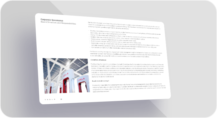 Corporate Governance Our Board of Directors’ commitment to guiding Tesla’s long-term vision is a key component of our ability to execute upon our Board Structure and Responsibilities mission to accelerate the world’s transition to sustainable energy. The Tesla Board has actively driven key decisions focused on achieving long-term growth and profitability, including decisions to: • Develop, manufacture and sell a range of electric vehicles from the ground up, including luxury, affordable and commercial- use models, rather than simply build powertrains for OEMs; • Deploy FSD city streets beta software to our fleet in order to develop complete full-self driving capability in the future; • Establish Tesla-owned stores and service centers rather than use a franchised dealer system; • Create a global network of Superchargers to enable long-distance EV travel; • Build the world’s largest battery factory to meet our needs and reduce battery costs; • Expand into energy generation (solar) and storage through the acquisition of SolarCity Corporation in 2016 to create a vertically integrated sustainable energy company and empower individual consumers to be their own utility; and • Compensate our CEO only if other shareholders realize tremendous value. The Board is directly and regularly engaged with senior management and the Sustainability Council and participates in robust shareholder outreach and feedback. In addition, our directors have significant experience as either top-level executives at public companies, as successful investors or as entrepreneurs who founded successful organizations. Committees of the Board The Board has four standing committees—the Audit Committee, the Compensation Committee, the Nominating and Corporate Governance Committee and the Disclosure Controls Committee—which are each further described in the following pages. Each member of these committees qualifies as an independent director under the listing standards of NASDAQ. In addition, as part of our governance review and succession planning, the Board (led by the Nominating and Corporate Governance Committee) evaluates our leadership structure to ensure that it remains the optimal structure for Tesla, reviews the composition, size and performance of the Board and its committees, evaluates individual directors and identifies and evaluates candidates for election or re-election to the Board. Board role in risk oversight The Board is responsible for overseeing the major risks facing Tesla, while management is responsible for assessing and mitigating Tesla’s risks on a day-to-day basis. In addition, the Board has delegated oversight of certain categories of risk to its independent committees, which then report to the Board, as appropriate, on matters that involve the specific areas of risk that each committee oversees. 78