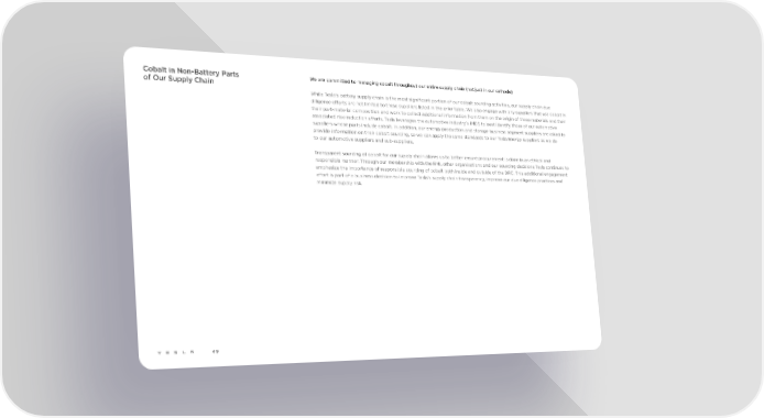 Cobalt in Non-Battery Parts We are committed to managing cobalt throughout our entire supply chain (not just in our cathode) of Our Supply Chain While Tesla’s battery supply chain is the most significant portion of our cobalt sourcing activities, our supply chain due diligence efforts are not limited to these suppliers listed in the prior table. We also engage with any suppliers that use cobalt in their part-material composition and work to collect additional information from them on the origin of these materials and their associated risk-reduction efforts. Tesla leverages the automotive industry’s IMDS to best identify those of our automotive suppliers whose parts include cobalt. In addition, our energy production and storage business segment suppliers are asked to provide information on their cobalt sourcing, so we can apply the same standards to our Tesla Energy suppliers as we do to our automotive suppliers and sub-suppliers. Transparent sourcing of cobalt for our supply chain allows us to better ensure procurement is done in an ethical and responsible manner. Through our membership with the RMI, other organizations and our sourcing decisions Tesla continues to emphasize the importance of responsible sourcing of cobalt both inside and outside of the DRC. This additional engagement effort is part of a business decision to improve Tesla’s supply chain transparency, improve our due diligence practices and minimize supply risk. 49