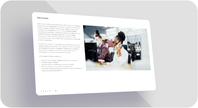 Introduction Tesla is on a mission to accelerate the world’s transition to sustainable energy. We focus relentlessly on innovation and rely on collaboration across our teams to help achieve this goal. Along the way, we are committed to maintaining safe and humane working conditions, ensuring that all workers, including those within our supply chain, are treated with respect and dignity and that our manufacturing processes are environmentally responsible. Internally, we are continuing to build a culture that is safe, respectful, fair and inclusive for all our employees. As cliché as it sounds, it is only thanks to our employees that we’ve gotten to where we are today. If we expect to continue innovating and changing the world for the better, we must ensure we have a talented and engaged workforce with ample opportunity to contribute to our mission and grow professionally. At the center of Tesla’s strategy is: • Regular and meaningful engagement with our employees; • A robust culture of safety; • Clear development pathways for all our employees; • Highly competitive compensation programs; and • Principles of diversity, equity and inclusion built into all aspects of hiring, promotion and retention. 55