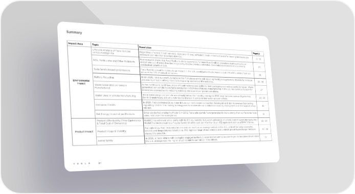 Summary Impact Area Topic Description Page(s) Lifecycle Analysis of Tesla Vehicles Regardless of where it is driven (U.S., Europe or China), a Model 3 made in Fremont emits far fewer greenhouse gas 11 - 22 versus Average ICE emissions per mile than a comparable ICE. New research shows that fossil fuels are alone responsible for more than 8 million premature deaths annually, or NOx, Particulates and Other Pollutants almost one out of every five deaths globally, double previous estimates. Zero tailpipe emissions is a commonly 23 overlooked benefit of EVs. Tesla Semi's Impact on Emissions Tesla Semi is poised to make a large impact: in the U.S., combination trucks make up just 1.1% of the vehicle fleet but 24 account for 17% of annual emissions. Battery Recycling In Q4 2020, Tesla successfully installed the first phase of the cell recycling facility at Gigafactory Nevada for in-house 25 - 26 processing of both battery manufacturing scrap and end-of-life batteries. Environmental Impact Waste Generated per Vehicle As we continue to build new, more efficient factories our ability to limit packaging and reduce waste increases. Waste Manufactured generated per vehicle in Shanghai production is 50% less than our manufacturing in the U.S. We continue to push for 27 innovative approaches to reducing waste as we expand our global operations. Water Used in Vehicle Manufacturing While water usage per vehicle was already below the industry average in 2020, new factories such as Gigafactory 28 - 29 Berlin-Brandenburg will set a new standard when it comes to low water use per vehicle. In 2020, Tesla delivered 2x as many EVs as our next closest competitor, helping drive $1.6bn in revenue from selling Emissions Credits regulatory credits. This money is being used to accelerate our production capacity deployment in direct support of our 30 mission. Net Energy Impact of our Products Since we started producing Model S in 2012, Tesla solar panels have generated 8x more energy than our factories have 31 consumed over the same period. Product Affordability (Price Equivalency Model 3 has achieved price parity with its ICE equivalents. But, when compared on a total cost of ownership basis, the 33 - 34 & Total Cost of Ownership) Model 3 is much closer to a Toyota Camry on all-in cost per mile than to an ICE equivalent such as a BMW 3 Series. Our data show that Tesla vehicles are used as much as an average vehicle in the U.S., utilized for daily commutes, Product Impact Product Usage & Usability errands and long-distance travel alike. The superior range of our vehicles and a robust global Supercharger Network 35 - 36 makes this possible. Active Safety In 2020, a Tesla vehicle with Autopilot engaged in the U.S. experienced just 0.2 accidents per million miles driven while 37 the U.S. average was ~9x higher at 2.0 accidents per million miles driven. 81