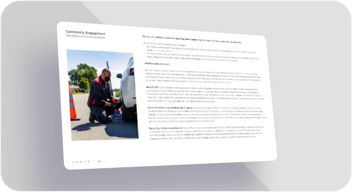 Community Engagement Tesla is committed to positively impacting and strengthening the communities in which we live and work Workforce Development We strive to accomplish this work through: • Workforce development and education programs that provide access to the community we aim to support and create equity for our workforce; • Building community connections to increase representation and ensure that job opportunities are promoted locally; and • Supporting environmental equity and connecting underrepresented communities to our mission. Workforce Development We are continuing to provide the local community access to thousands of job openings across the U.S. in manufacturing, vehicle service and solar roof installation, offering full benefits and training from day one. We have long stated publicly that candidates do not need to have a college degree to work at Tesla. This represents an enormous opportunity for high school graduates from underserved communities to join us in our mission and grow their careers. Tesla START is an intensive training program that provides students across North America with the skills necessary for a successful career at Tesla and beyond. During the program, students develop technical expertise and earn certifications through in-class theory, hands-on labs and self-paced learning. We partner with community colleges across the country to integrate Tesla START into automotive and manufacturing curriculums as a multi-week capstone. Since the launch over START over 550 students have been placed in full-time employment at Tesla. Tesla’s Manufacturing Development Program is a two-year program where recent high school graduates in the U.S. start a career at Tesla as a Production Associate while continuing their education in automation and robotics at a local community college. To date, we've hired 168 graduates into this program since launching in 2017, with active programs at Gigafactory Nevada, Gigafactory New York and our Fremont Factory. We also launched our first Manufacturing Development Program class with Del Valle High School to support Gigafactory Texas in fall 2021. Tesla’s Tool & Die Apprenticeship Tesla offers a federal and state certified Tool & Die Apprenticeship program in the U.S., in partnership with local community colleges, at the Fremont Factory, Gigafactory Nevada and Tesla Grand Rapids. These apprenticeships blend on-the-job training by qualified mentors with classroom learning, providing a holistic approach to learning a trade in high demand. Apprentices learn welding, machining, blueprint reading and other critical skills. 67
