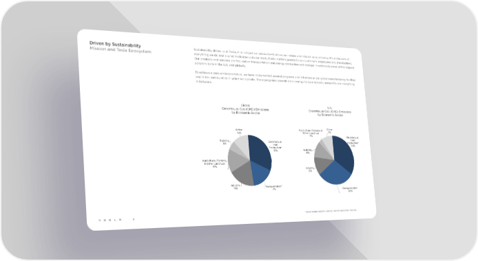 Driven by Sustainability Sustainability drives us at Tesla. And not just our products—it drives our values and mission as a company. It’s at the core of Mission and Tesla Ecosystem everything we do and is what motivates us in our work. It also matters greatly to our customers, employees and shareholders. Our products and services are focused on transportation and energy production and storage—traditionally some of the biggest polluters both in the U.S. and globally. To achieve a zero-emissions future, we have implemented several programs and initiatives at our global manufacturing facilities and in the communities in which we operate. These programs provide clean energy to local schools, nonprofits and everything in between. Global U.S. Greenhouse Gas (GHG) Emissions Greenhouse Gas (GHG) Emissions by Economic Sector by Economic Sector Other Agriculture, Forestry & Other 12% Other Land Use 9% 3% Electricity & Building Electricity & Heat 6% Heat Production* Production* 35% 31% Building 11% Agriculture, Forestry & Other Land Use 15% Industry 12% Industry Transportation* 19% 17% Transportation* 30% *Tesla-related sectors. Source: World Resources Institute 7