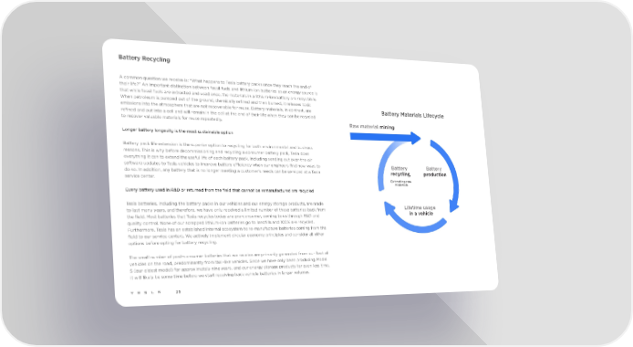 Battery Recycling A common question we receive is: “What happens to Tesla battery packs once they reach the end of their life?” An important distinction between fossil fuels and lithium-ion batteries as an energy source is that while fossil fuels are extracted and used once, the materials in a lithium-ion battery are recyclable. When petroleum is pumped out of the ground, chemically refined and then burned, it releases toxic emissions into the atmosphere that are not recoverable for reuse. Battery materials, in contrast, are Battery Materials Lifecycle refined and put into a cell and will remain in the cell at the end of their life when they can be recycled to recover valuable materials for reuse repeatedly. Longer battery longevity is the most sustainable option Battery pack life extension is the superior option to recycling for both environmental and business reasons. This is why before decommissioning and recycling a consumer battery pack, Tesla does everything it can to extend the useful life of each battery pack, including sending out over-the-air software updates to Tesla vehicles to improve battery efficiency when our engineers find new ways to do so. In addition, any battery that is no longer meeting a customer’s needs can be serviced at a Tesla service center. Extracting raw materials Every battery used in R&D or returned from the field that cannot be remanufactured are recycled Tesla batteries, including the battery packs in our vehicles and our energy storage products, are made to last many years, and therefore, we have only received a limited number of these batteries back from the field. Most batteries that Tesla recycles today are pre-consumer, coming to us through R&D and quality control. None of our scrapped lithium-ion batteries go to landfills and 100% are recycled. Furthermore, Tesla has an established internal ecosystem to re-manufacture batteries coming from the field to our service centers. We actively implement circular economy principles and consider all other options before opting for battery recycling. The small number of post-consumer batteries that we receive are primarily generated from our fleet of vehicles on the road, predominantly from taxi-like vehicles. Since we have only been producing Model S (our oldest model) for approximately nine years, and our energy storage products for even less time, it will likely be some time before we start receiving back vehicle batteries in larger volumes. 25