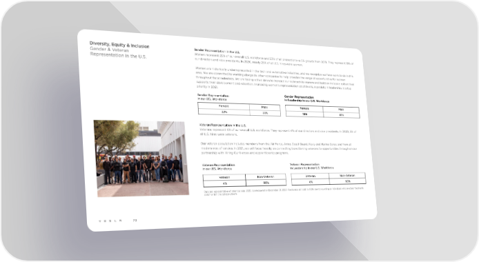 Diversity, Equity & Inclusion Gender Representation in the U.S. Gender & Veteran Women represent 22% of our overall U.S. workforce and 23% of all promotions—a 5% growth from 2019. They represent 19% of Representation in the U.S. our directors and vice presidents. In 2020, nearly 25% of all U.S. hires were women. Women are historically underrepresented in the tech and automotive industries, and we recognize we have work to do in this area. We are committed to working alongside other companies to help broaden the range of opportunities for women throughout these industries. We are taking active steps to increase our outreach to women and build an inclusive culture that supports their development and retention. Increasing women’s representation at all levels, especially in leadership, is a top priority in 2021. Gender Representation Gender Representation in our U.S. Workforce in Leadership in our U.S. Workforce Female Male Female Male 22% 78% 19% 81% Veteran Representation in the U.S. Veterans represent 4% of our overall U.S. workforce. They represent 4% of our directors and vice presidents. In 2020, 3% of all U.S. hires were veterans. Our veteran population includes members from the Air Force, Army, Coast Guard, Navy and Marine Corps and from all modern eras of service. In 2021, we will focus heavily on connecting transitioning veterans to opportunities through on our partnership with Hiring Our Heroes and apprenticeship programs. Veteran Representation Veteran Representation in our U.S. Workforce in Leadership in our U.S. Workforce Veteran Non-Veteran Veteran Non-Veteran 4% 96% 4% 96% Data are representative of calendar year 2020, as measured on December 31, 2020. Totals may not add to 100% due to rounding or individuals who selected “decline to state” or left the category blank. 73