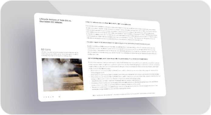 Lifecycle Analysis of Tesla EVs vs. Using only real-world data, not official NEDC, WLPT or EPA* consumption data Equivalent ICE Vehicles The most important variable in a lifecycle analysis of an automobile is real-world fuel consumption or electricity consumption, as applicable, which impacts the use phase of the lifecycle. Various efficiency testing cycles such as NEDC, WLTP or EPA do not truly represent real-world fuel or energy consumption. Therefore, for the purpose of this analysis, we used average energy consumption over the more than 10 billion miles Tesla Model 3s have travelled as of December 31, 2020, including energy losses during the charging process. For ICE vehicles, we used real-world fuel consumption data provided by Consumer Reports, which reports model year 2020 mid-size premium sedans achieve 24.8 MPG on average. This translates to ~400 grams of CO per 2 mile once we account for emissions generated through the extraction, refining and shipment of oil. The carbon impact of ICE vehicles remains the same every year of use, but for EVs, it should improve every year Based on publicly available sales and fleet data, we estimate that an average vehicle in the U.S. is driven slightly less than 12,000 miles per year for about 17 years before it is scrapped. Furthermore, as an ICE vehicle ages, its fuel efficiency only 69 tons remains stable if serviced properly. On the other hand, electricity generation to charge EVs has become “greener” over time Lifetime CO e emitted by an average internal combustion engine with the addition of cleaner energy sources to the grid. Thus, emissions generated through EV charging should continue to 2 decline over time. vehicle (model year 2020) sold in the U.S. through its use phase, excluding CO2e emitted during the oil refining phase. On the following pages, we will show the per mile lifecycle emissions of a current Fremont-made Model 3 This includes emissions from upstream supply chain, direct emissions from manufacturing and electricity consumption, and use phase emissions when charged from a grid with a generation mix that reflects the geographic distribution of Model 3 deliveries in each of the U.S., Europe and China. Below are the lifecycle emissions scenarios we show, and the assumptions used in each of the charts on the following pages: • What emissions per mile could be if a Model 3 were used for ridesharing over one million miles using cell chemistry from Tesla energy products. • What emissions per mile could be if a Model 3 were principally charged at home using a solar system and energy storage. • What emissions per mile could be if a Model 3 were used for ridesharing over one million miles using cell chemistry from our energy products and if it were only charged using a solar system and energy storage. • The reference ICE vehicle is based on the average mid-size premium sedan in the U.S. • Charging a Model 3 using solar panels and a Powerwall adds emissions to the manufacturing phase while reducing use phase emissions to as low as zero when 100% of charging is done using that system. • We assume no additional renewable energy capacity on the grid during the life of the vehicle given the shape of the renewable energy adoption curve is still very much up for debate. 12 * NEDC = New European Driving Cycle; WLPT = Worldwide Harmonised Light Vehicles Test Procedure; EPA = U.S. Environmental Protection Agency