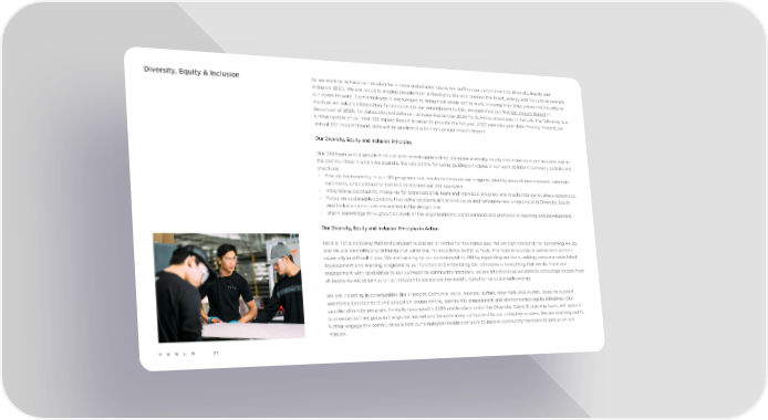 Diversity, Equity & Inclusion As we work to achieve our mission for a more sustainable future, we reaffirm our commitment to Diversity, Equity and Inclusion (DEI). We are proud to employ people from all backgrounds who possess the talent, energy and focus to accelerate our vision forward. Each employee is encouraged to bring their whole self to work, knowing that Tesla values individuality as much as we value collaboration. To demonstrate our commitment to DEI, we published our first DEI Impact Report in December of 2020, for data collected between January-September 2020 for full-time employees in the U.S. The following is a further update of our first DEI Impact Report in order to provide the full-year 2020 calendar year data. Moving forward, our annual DEI Impact Report data will be published within this annual Impact Report. Our Diversity, Equity and Inclusion Principles Our DEI team uses a people-first and data-driven approach to champion diversity, equity and inclusion in our business and in the communities in which we operate. We rely on the following guiding principles in our work to inform company policies and practices: • Provide transparency in our DEI programs and results to measure our progress, identify areas of improvement, celebrate successes, and continually iterate and improve our DEI approach; • Integrate accountability measures for organizational, team and individual progress and results into our business operations; • Focus on sustainable solutions that solve problems at the root cause and reimagine new programs with Diversity, Equity and Inclusion principles embedded in the design; and • Share knowledge throughout all levels of the organization to aid in personal and professional learning and development. Our Diversity, Equity and Inclusion Principles in Action Tesla is not a company that rests on past successes or settles for the status quo. We set high standards for everything we do, and we are committed to bringing that same bias for excellence to DEI at Tesla. The road to success is paved with action— especially in difficult times. We are backing up our commitment to DEI by expanding our team, adding company-wide talent development and learning programs to our function and embedding DEI principles in everything that we do. From our engagement with candidates to our outreach to community members, we are intentional as we work to encourage people from all backgrounds to join us on our mission to accelerate the world’s transition to sustainable energy. We are investing in communities like Fremont, California; Reno, Nevada; Buffalo, New York; and Austin, Texas, to support workforce development and education programming, community engagement and environmental equity initiatives. Our supplier diversity program, formally revamped in 2020 and in place under the Diversity, Talent & Learning team, will support businesses as they grow in the global market and become a key component to our collective success. We are reaching out to further engage the communities where our employees reside and work to inspire community members to join us on our mission. 71